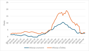 Grafikon 1 – Stope inflacije u Češkoj i eurozoni, promjena cijena u odnosu na isti mjesec prethodne godine, harmonizirani indeks potrošačkih cijena